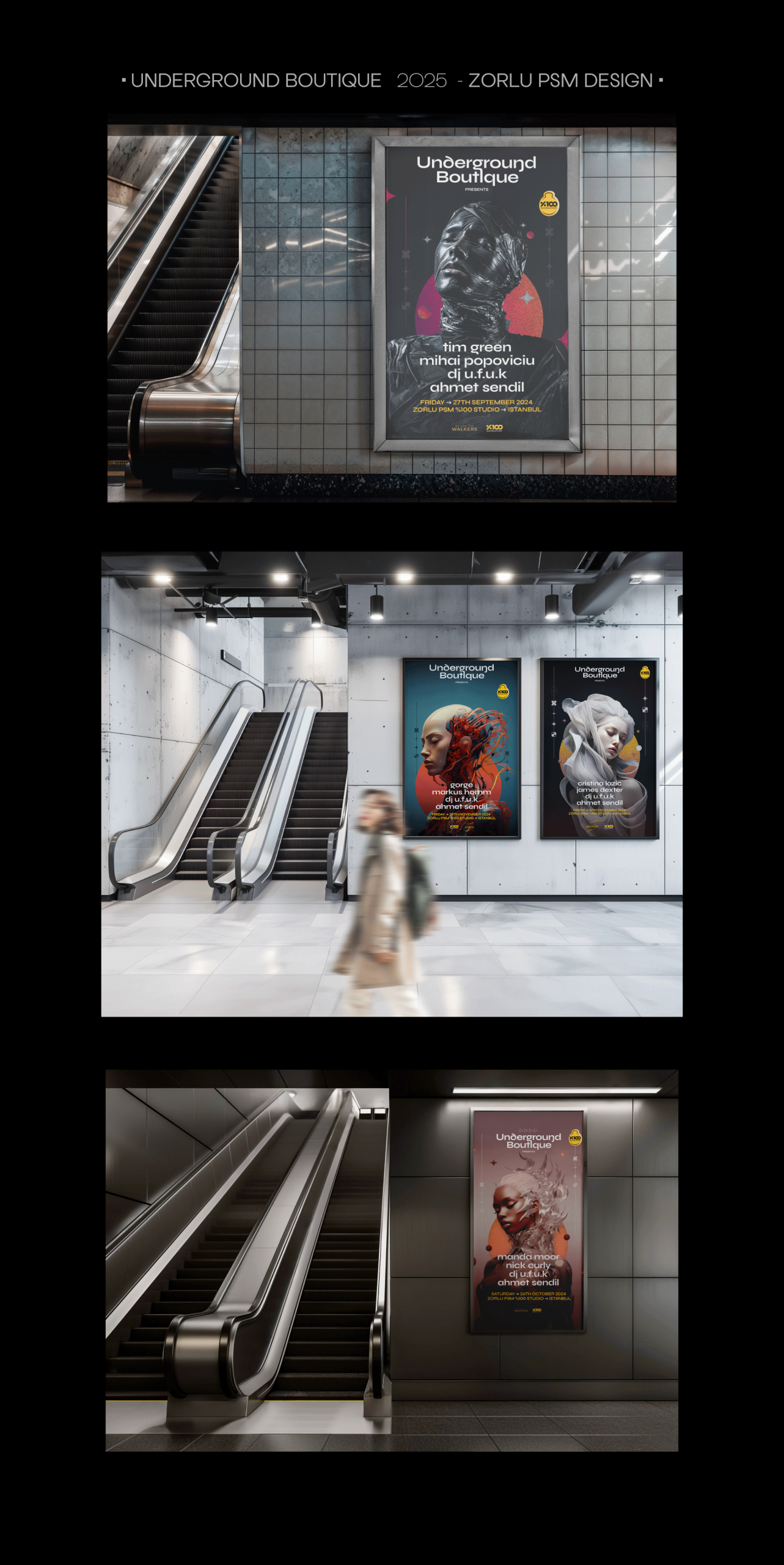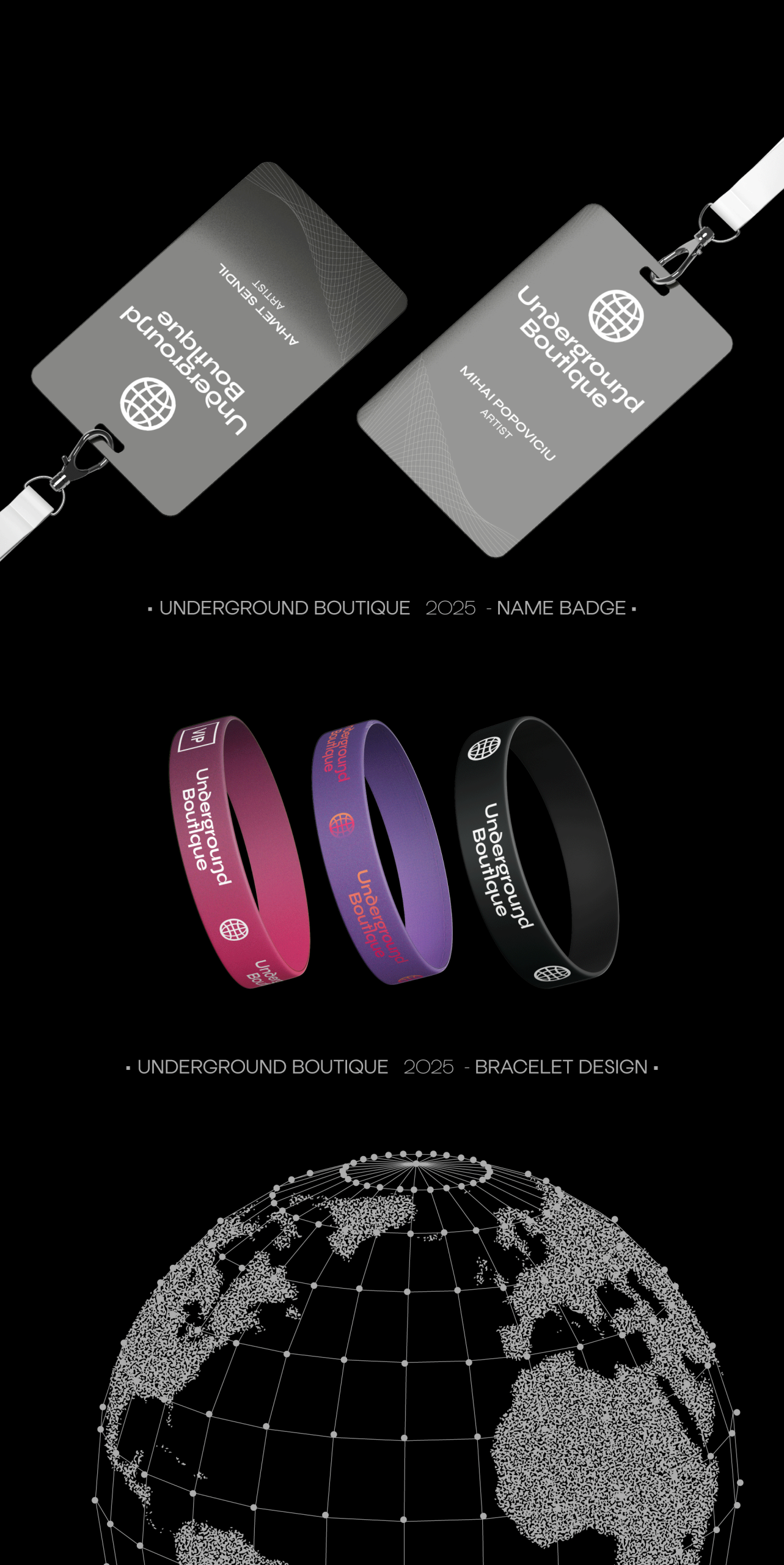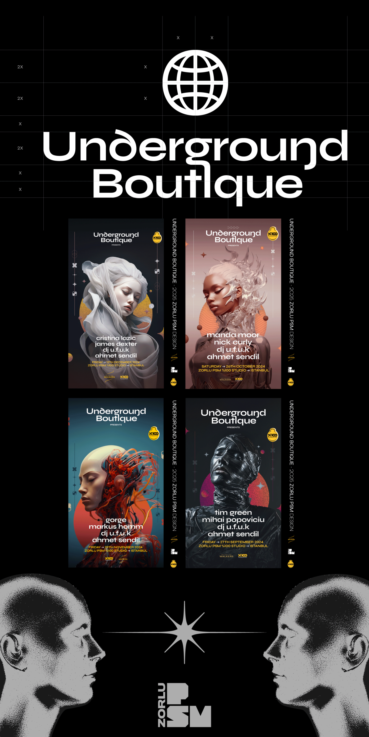 For the Underground Boutique event series, which explores the roots of electronic music, I prepared design adaptations for different platforms as well as custom sizing for Zorlu PSM. In addition, I created a bracelet and staff badge design for the project.